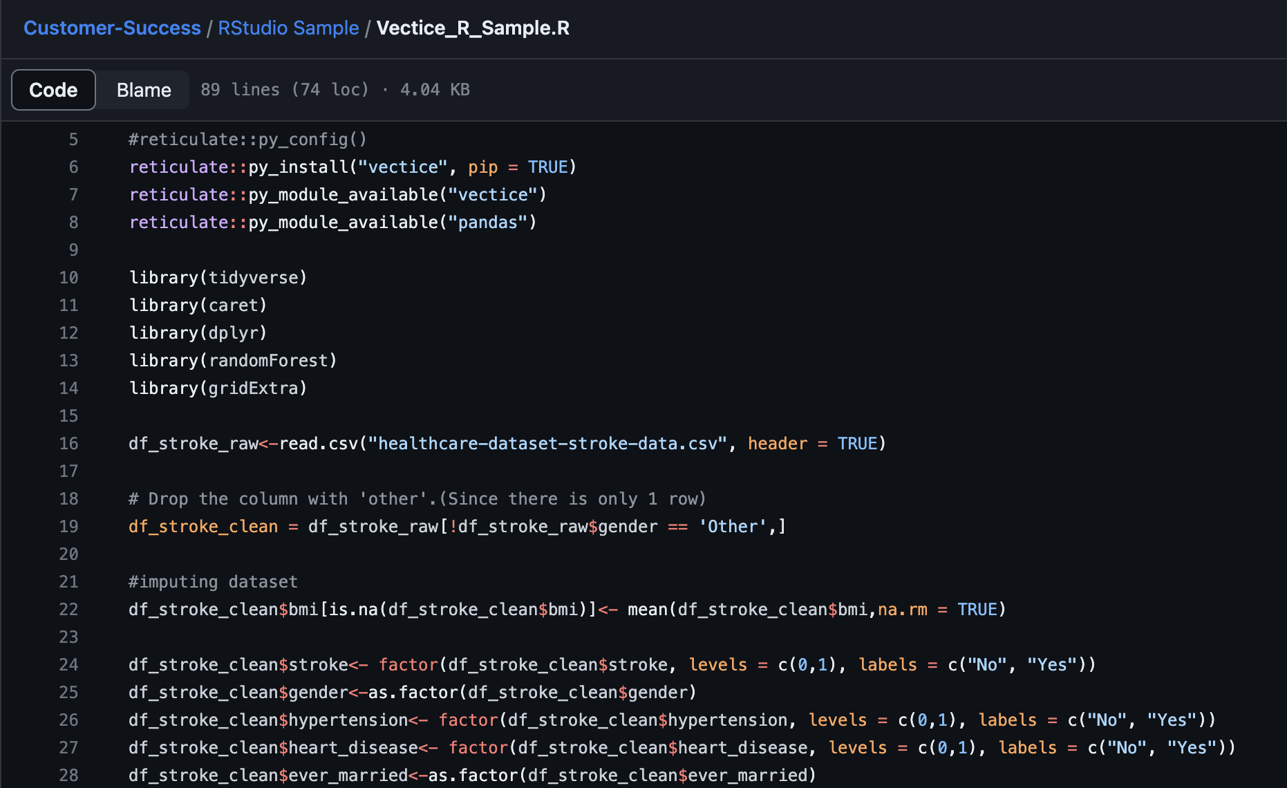 <table data-card-size="large" data-view="cards"><thead><tr><th></th><th></th><th data-hidden></th><th data-hidden data-type="content-ref"></th><th data-hidden data-card-target data-type="content-ref"></th><th data-hidden data-card-cover data-type="files"></th></tr></thead><tbody><tr><td><mark style="color:blue;"><strong>Vectice R Sample</strong></mark></td><td>Learn how you can use Vectice with R!</td><td></td><td></td><td><a href="https://github.com/vectice/Customer-Success/blob/develop/RStudio%20Sample/Vectice_R_Sample.R">https://github.com/vectice/Customer-Success/blob/develop/RStudio%20Sample/Vectice_R_Sample.R</a></td><td><a href="https://content.gitbook.com/content/8YrnbufMoM0F8ne1PWTU/blobs/cdwdWW4pPucPvvRiqtvT/Screen%20Shot%202023-10-19%20at%201.23.07%20PM.png">Screen Shot 2023-10-19 at 1.23.07 PM.png</a></td></tr><tr><td></td><td></td><td></td><td></td><td></td><td></td></tr></tbody></table>
