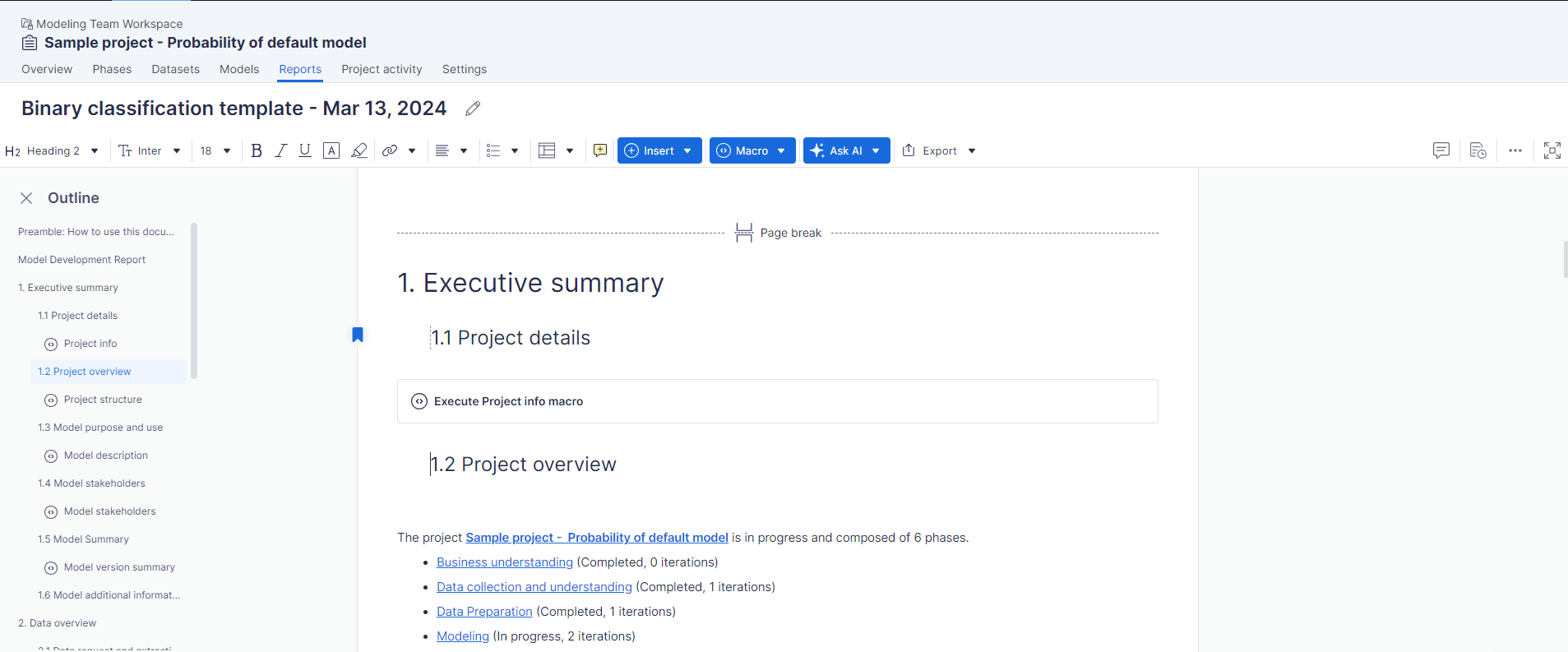 Global macros and report templates for consistent style and formatting across customer organizations provided and maintained by Vectice.