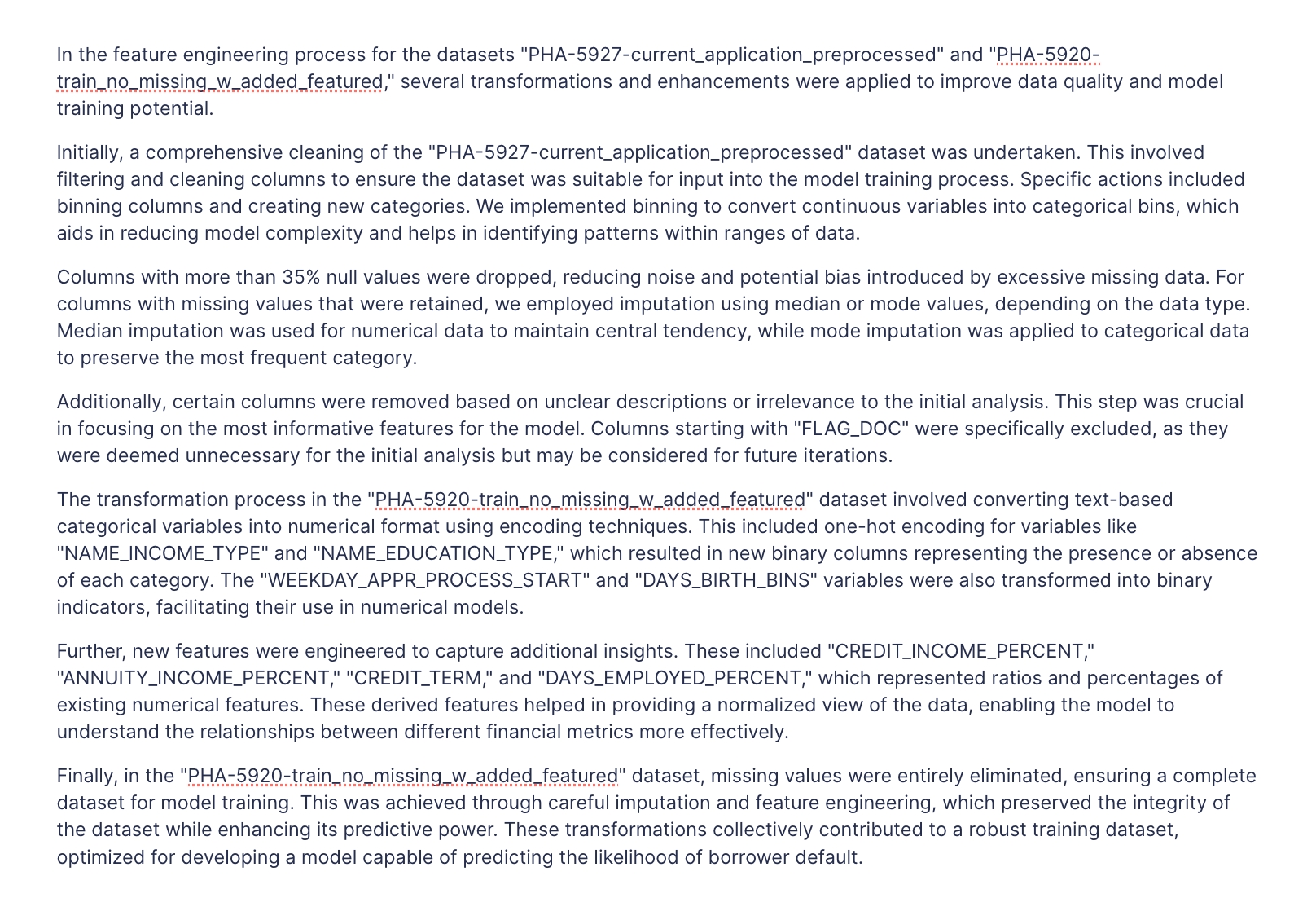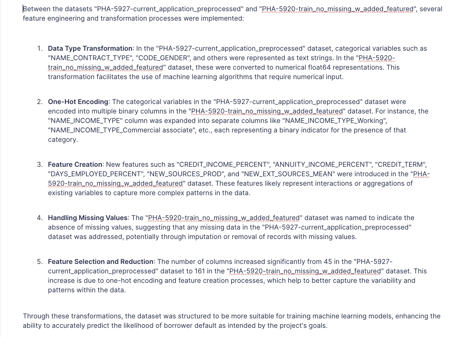 Explain what feature engineering and transformations that happened between those 2 datasets {{ DTV-358 }} and {{ DTV-370 }}.