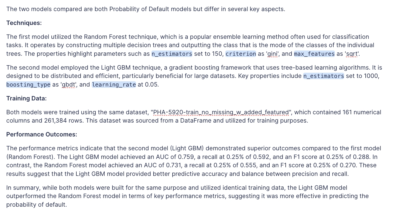 The following AI prompt will summarize your model's technique, performance metrics and insert attachments.