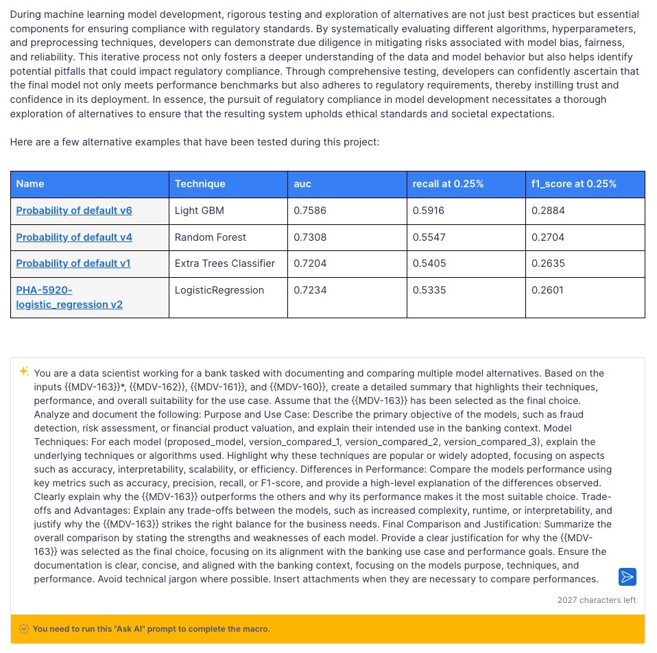 AskAI empowers data scientists to generate clear, tailored documentation for iterations, models, or datasets with ease. Whether using the “Ask Me Anything” feature for custom prompts or documenting directly from your assets using Macros, AskAI ensures all key details are documented seamlessly—so you can focus on your work, not the paperwork.