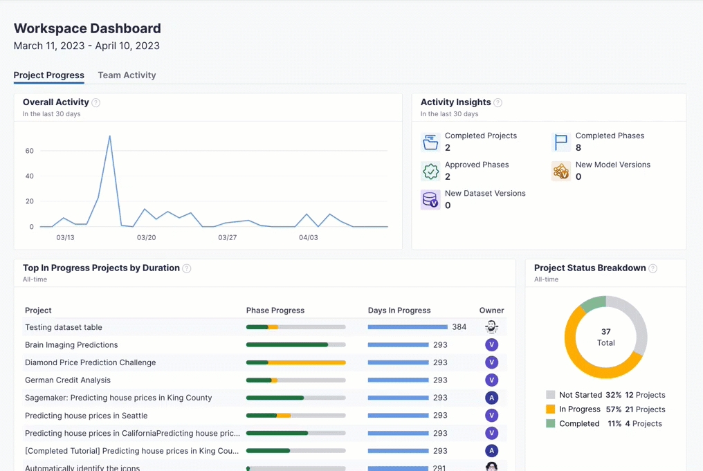 The Workspace Dashboard gives Data Science Managers and Executives insight into project progress and team activity in Vectice. It helps track projects, spot risks, and manage workloads to prevent delays.