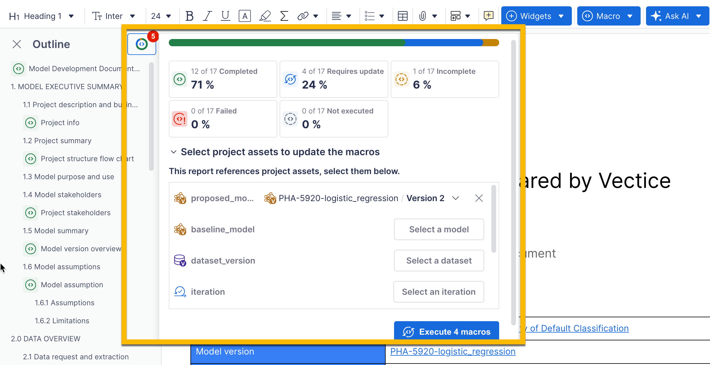 1. **Global macros and report templates** for consistent style and formatting across customer organizations provided and maintained by Vectice.