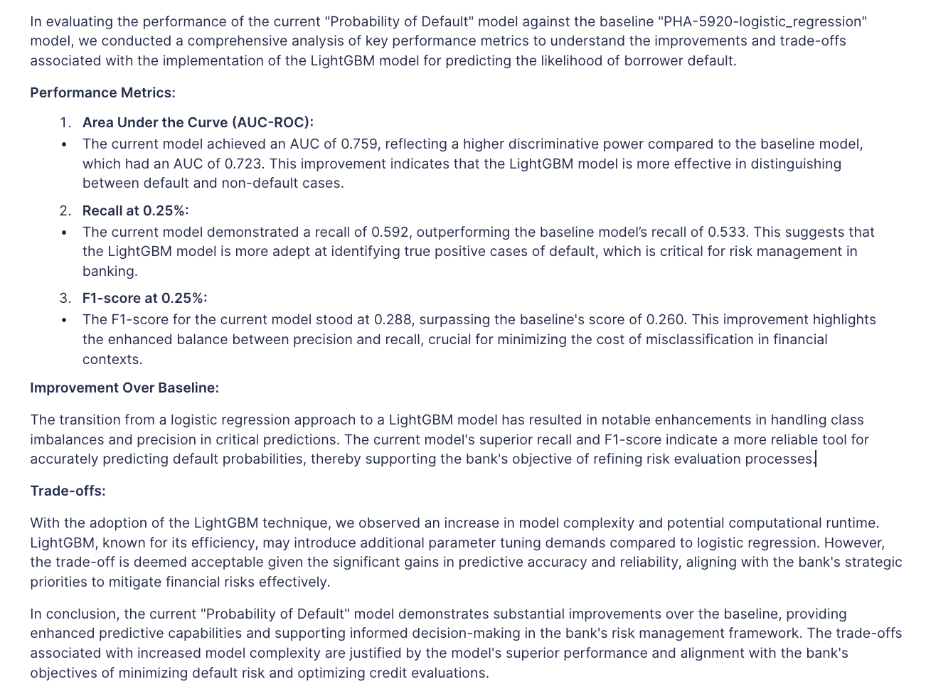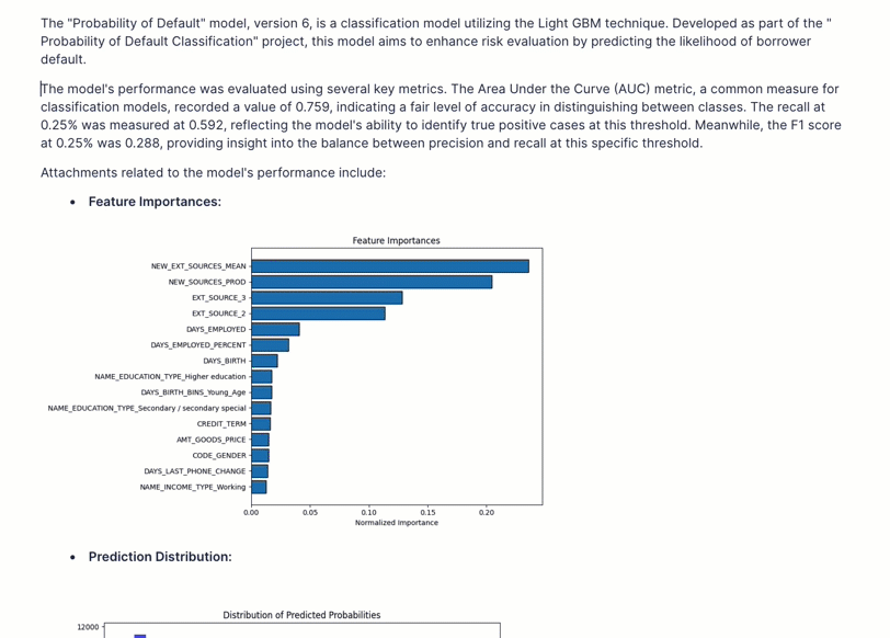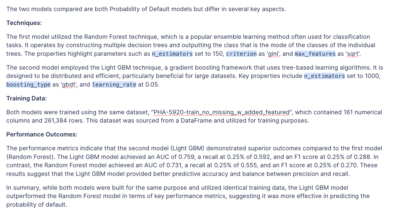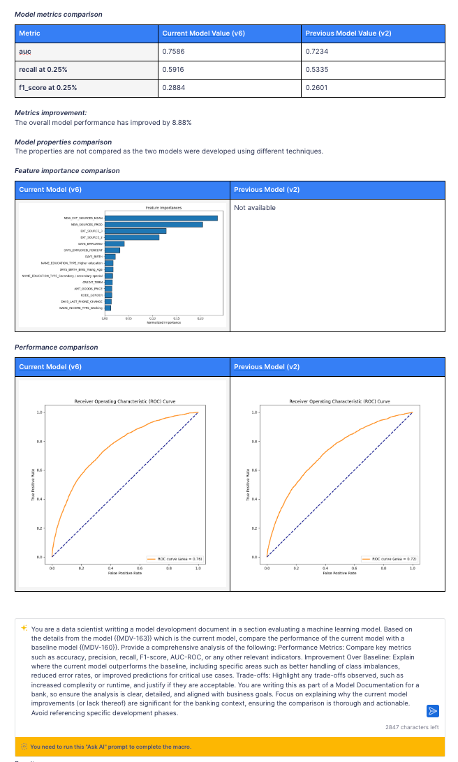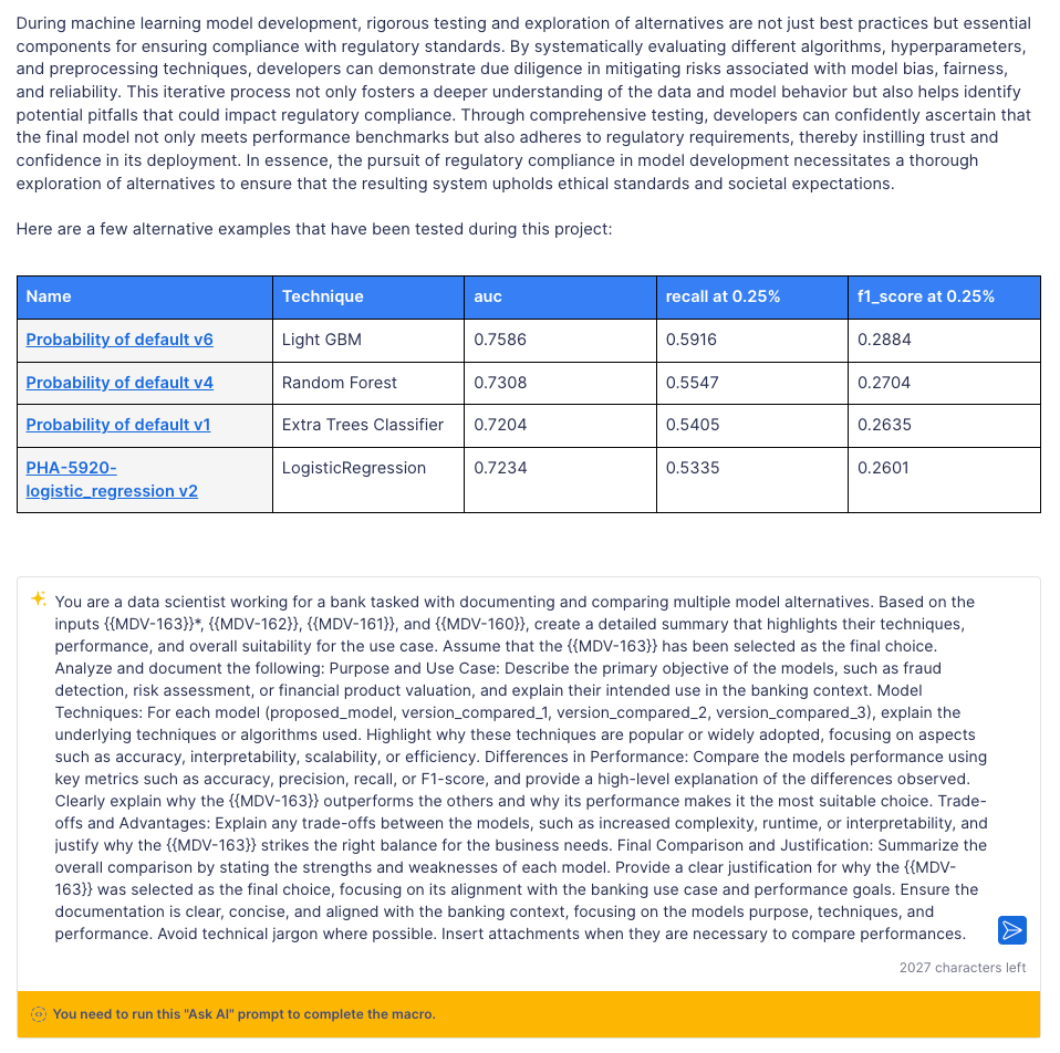 The following AI prompt will summarize your model's technique, performance metrics and insert attachments.