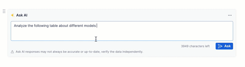 The following prompt allows you to pass a table or CSV file directly into the prompt, enabling AskAI to analyze and summarize the data seamlessly. This option is ideal for generating insights, summaries, or comparisons based on structured data.