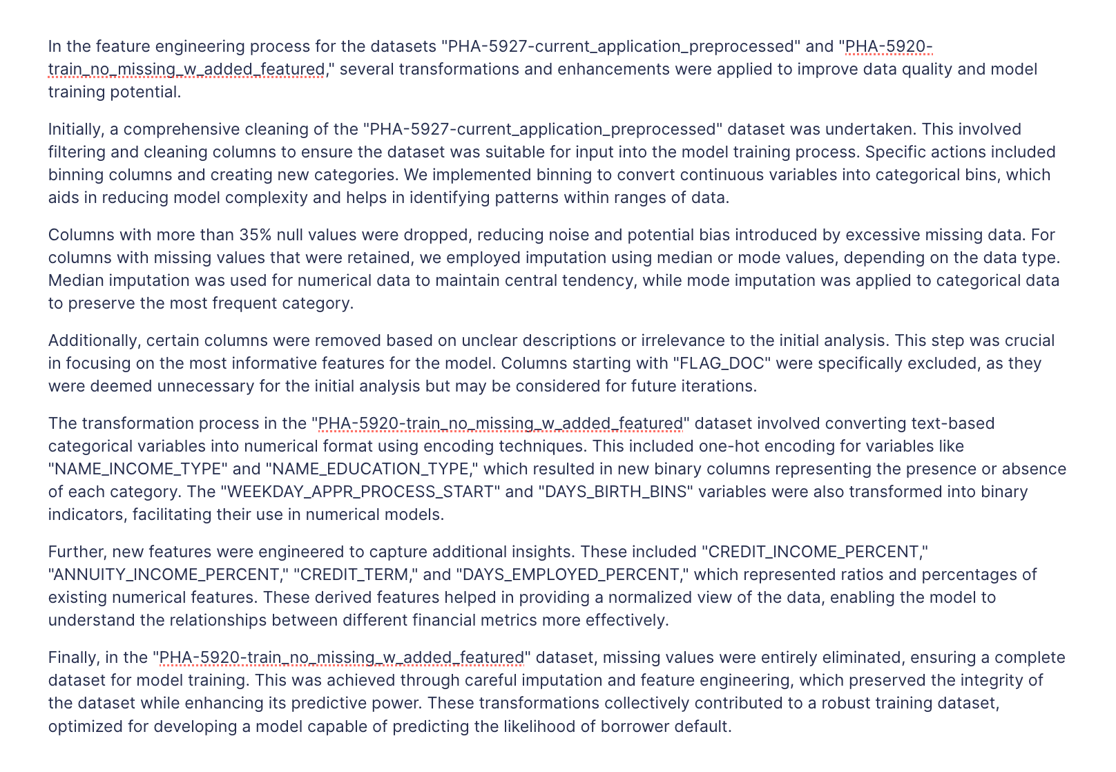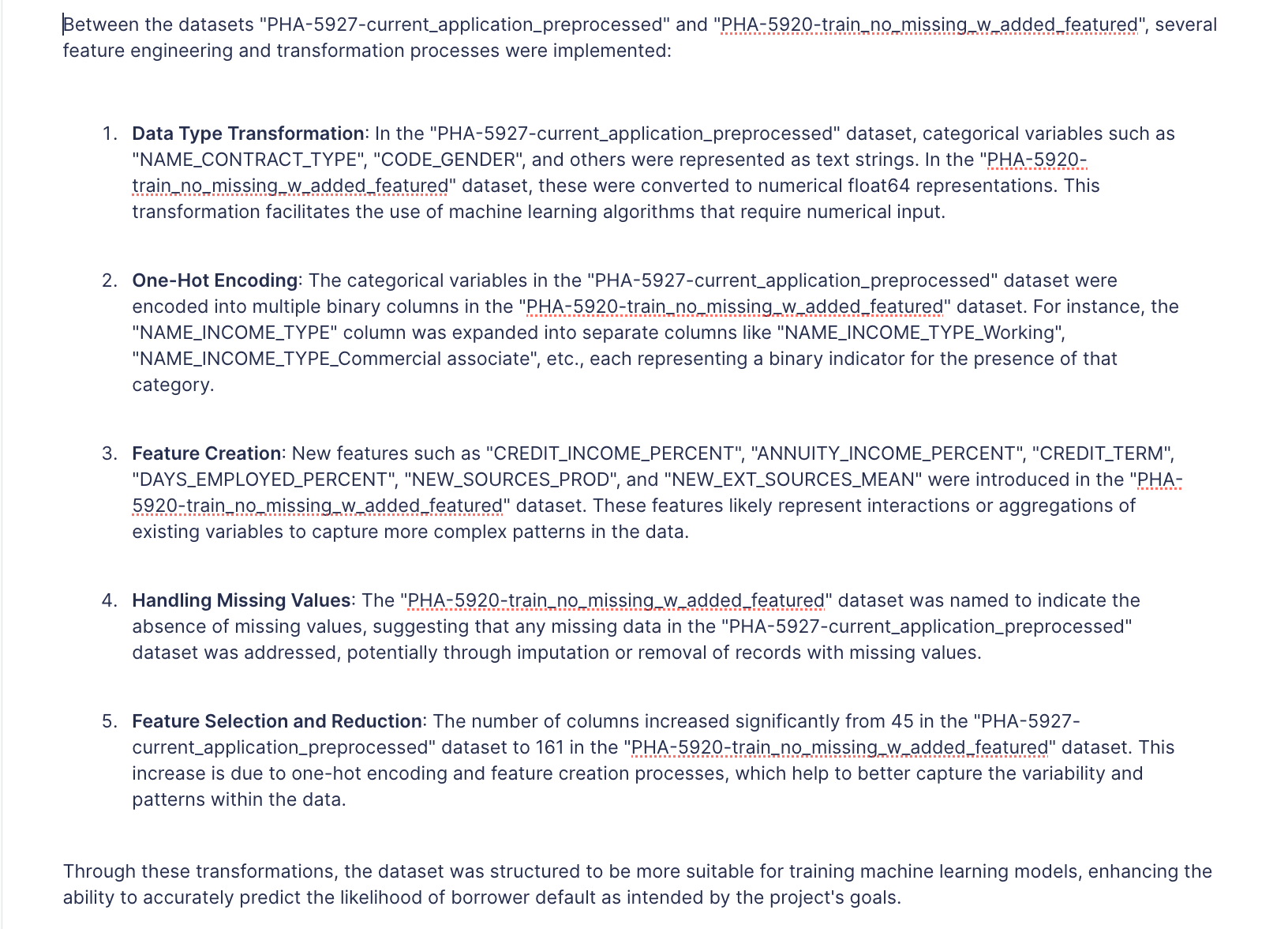 Prompt to derive the feature engineering that happened between 2 datasets. The LLM will look at the distribution of the columns and all of the metadata and infer the feature engineering.