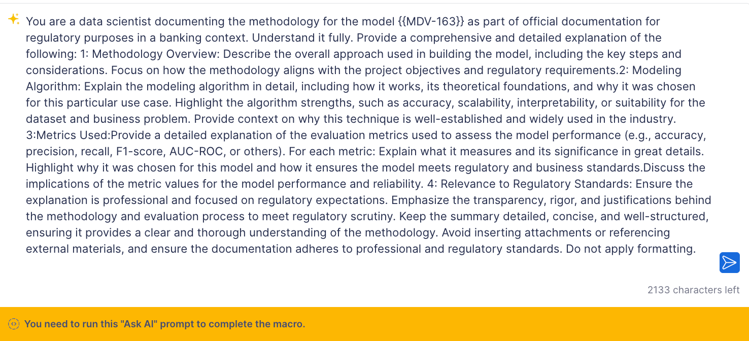 AskAI empowers data scientists to generate clear, tailored documentation for iterations, models, or datasets with ease. Whether using the โAsk Me Anythingโ feature for custom prompts or documenting directly from your assets using Macros, AskAI ensures all key details are documented seamlesslyโso you can focus on your work, not the paperwork.