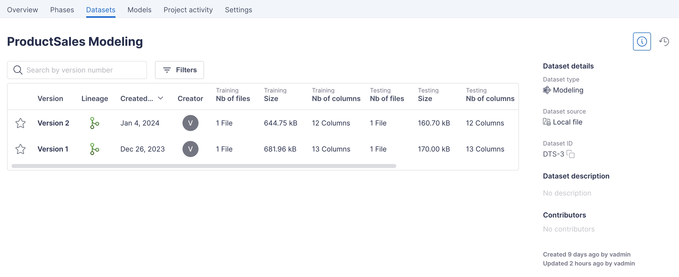 Dataset versions are datasets with the same name as another dataset that you have already logged in Vectice. Logging datasets with the same name automatically increment the versions, maintaining the dataset's history.