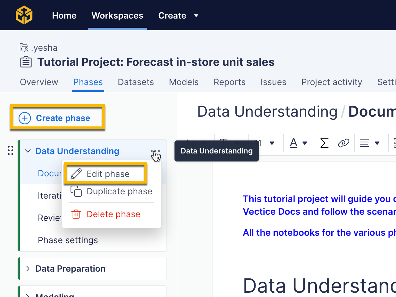 If you selected a project that has predefined phases, you can add a new phase by selecting Create phase or you can edit the names of the preexisting phase by selecting Edit phase.