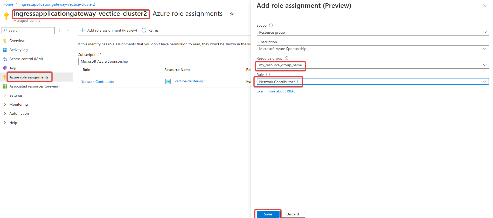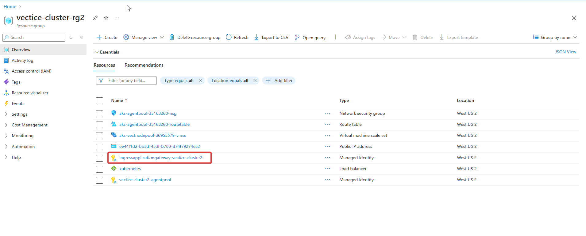 Navigate to the AKS managed Resource group created along with the cluster and Click on the managed Identity that contains the name of your AG (it might take a few minutes to appear).