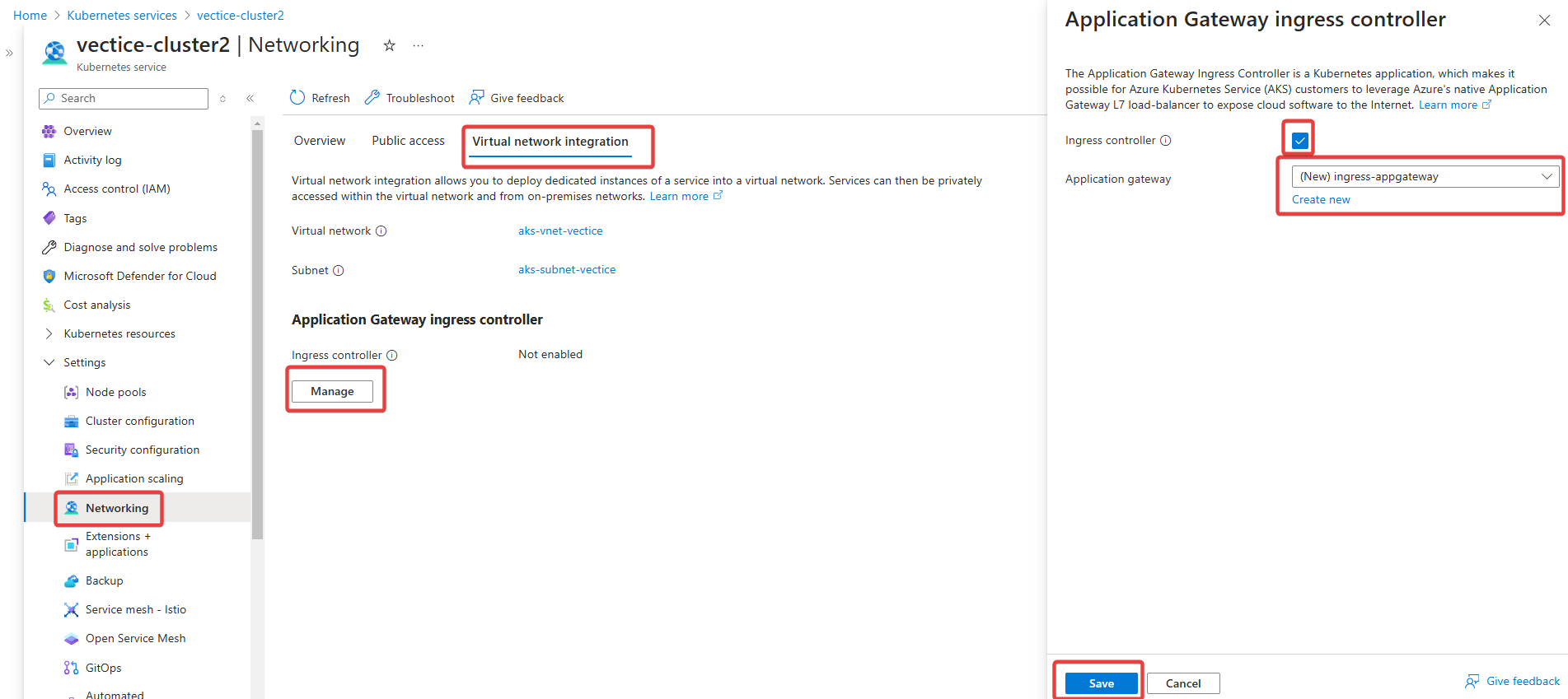 To enable the AGIC add-on, go to the Kubernetes services page and select your Cluster. Go to the Settings > Networking and Virtual Network Integration tab to find the application gateway ingress controller section. Click on the ManageCheck box next to Enable ingress controller, and Create a new Application Gateway or Select your existing one.