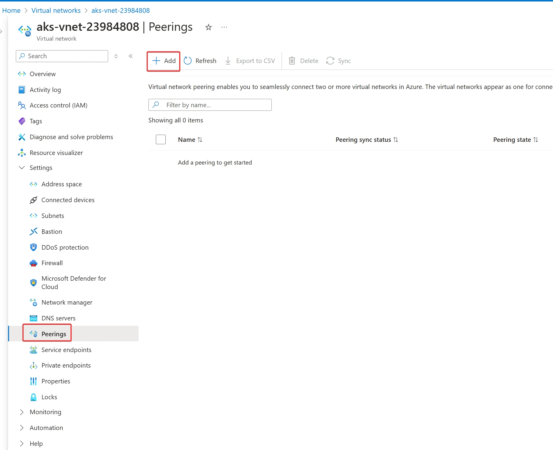 Create the VNet Peering between the PostgreSQL VNet and the AKS VNet. To do so, go to the “Virtual Networks” menu and Click on the AKS VNet