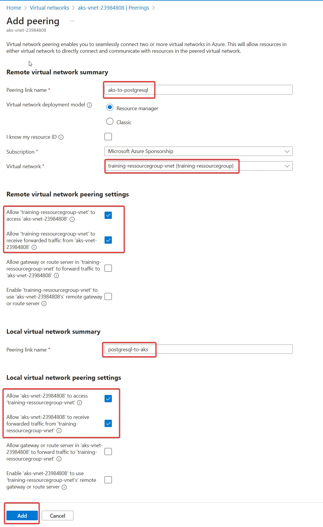 Create a Peering between the AKS VNet and the PostgreSQL VNet