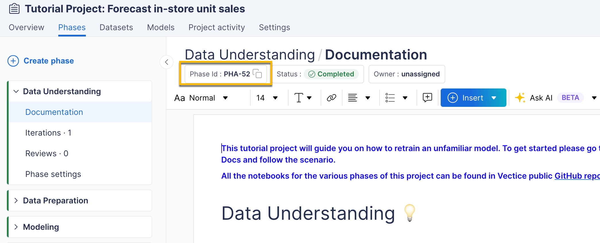phase.list_iterations()To find asset IDs for Dataset and Model, you must retrieve the IDs from the Vectice app.