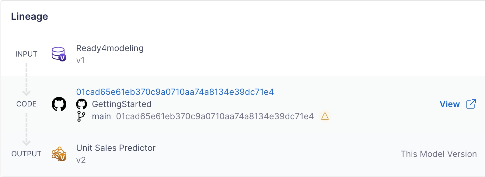 Code captured the following changed files; <filename>.txt, <anotherfilename>.txtIn the Vectice app, you can view the git branch and the commit hash. You can click the git hash or View to see your code changes in your repository.