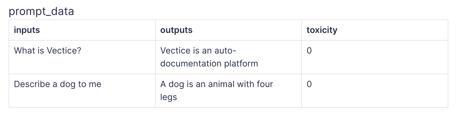 "outputs": ["Vectice is an auto-documentation platform", "A dog is an animal with four legs"],