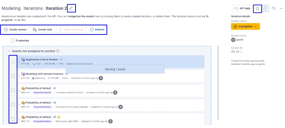 • Rename iterations, create sections, move assets with drag-and-drop, delete assets, star your iteration, and update the status.