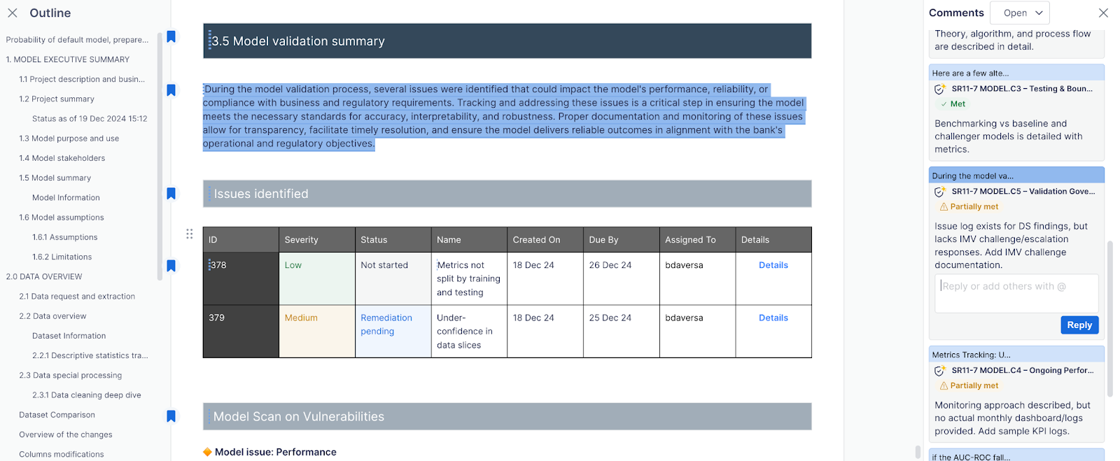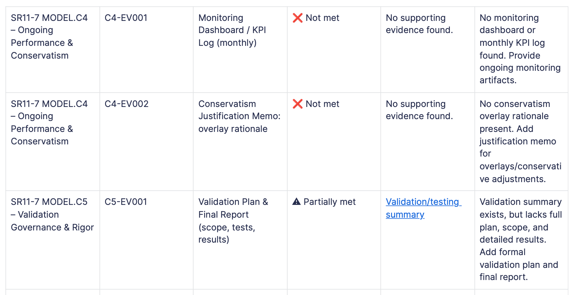 Automated Compliance Checks (ACC) score a model document against an internal control set or a regulation (e.g. SR 11-7) and return met / partially met / not met per control, with concrete recommendations.
