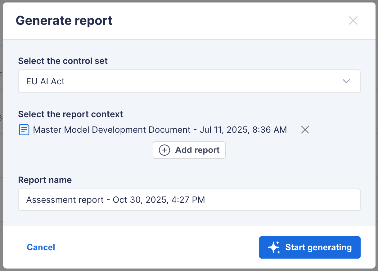 Click Generate report → Assessment, then select the control set (e.g. SR 11-7).