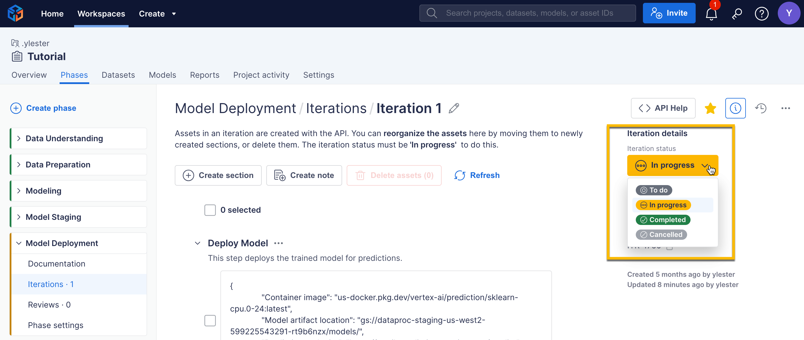 Once you start an iteration in the API, its status automatically changes to "In progress." Once you are complete, you can update your iteration status by marking it complete.